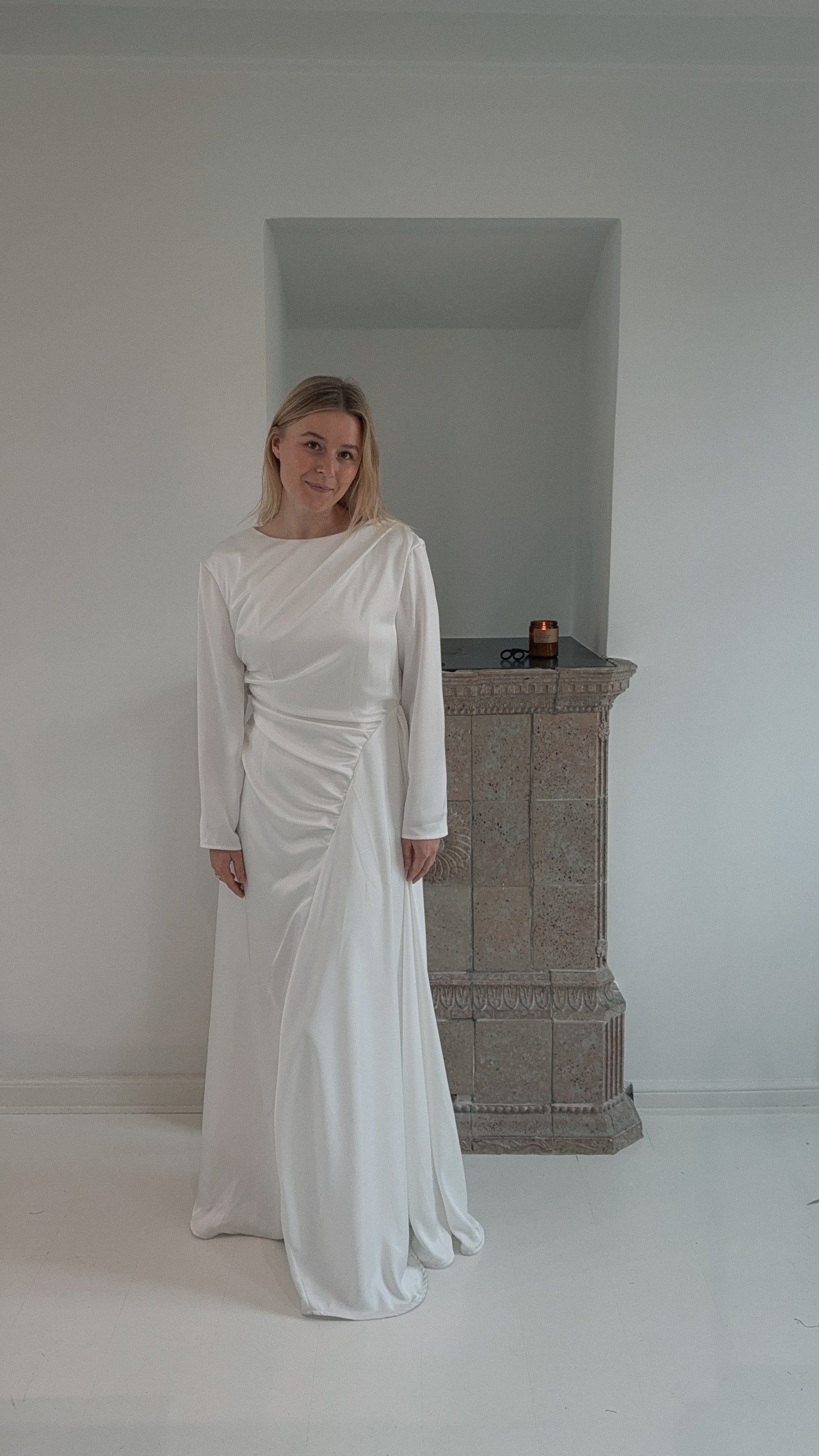 Long sleeves frame the form, while the gathered fabric shapes a sense of ease and quiet strength.